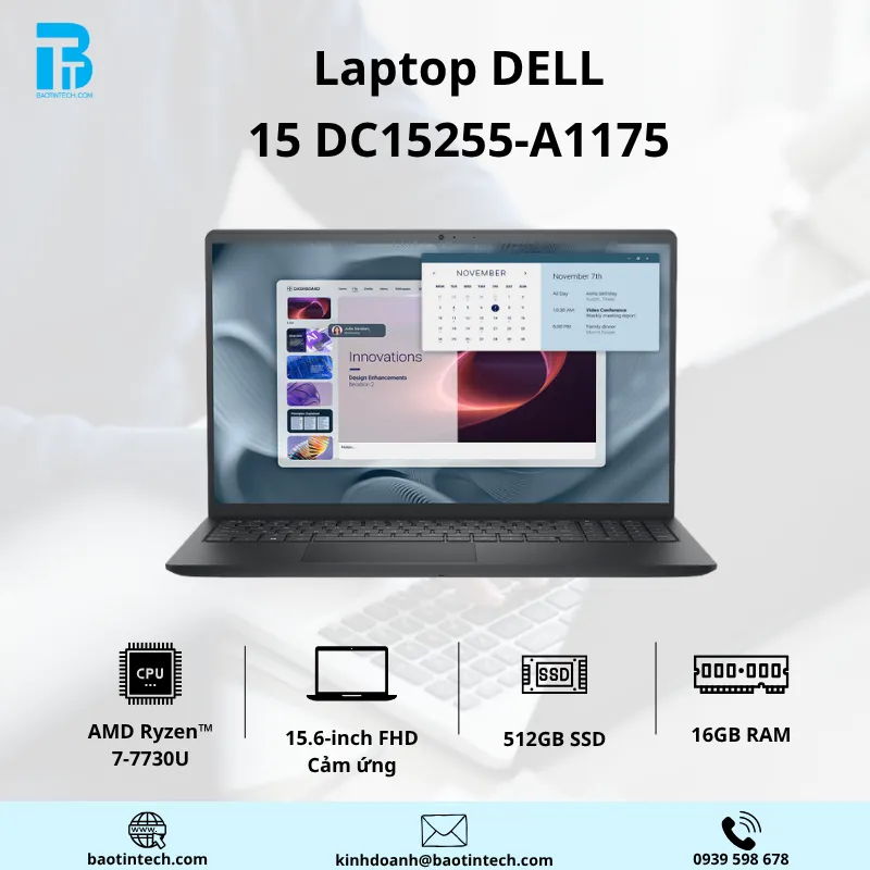 Laptop Dell DC15255-A1175 (Ryzen 7 7730U | 16GB Ram | 512GB SSD | 15.6 inch FHD | Cảm ứng | WIN11 Bản Quyền | BLACK )
