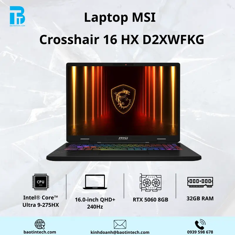 Laptop MSI Crosshair 16 HX AI D2XWFKG là lựa chọn hoàn hảo cho game thủ, nhà thiết kế đồ họa và người dùng cần một chiếc laptop mạnh mẽ, màn hình lớn và đồ họa xuất sắc. Máy được trang bị bộ vi xử lý Intel U9-275HX mạnh mẽ, kết hợp RAM 32GB và ổ SSD 1TB, mang lại khả năng xử lý đa nhiệm vượt trội, tốc độ truy xuất dữ liệu nhanh và chạy mượt các phần mềm nặng, từ game AAA đến ứng dụng đồ họa chuyên nghiệp.