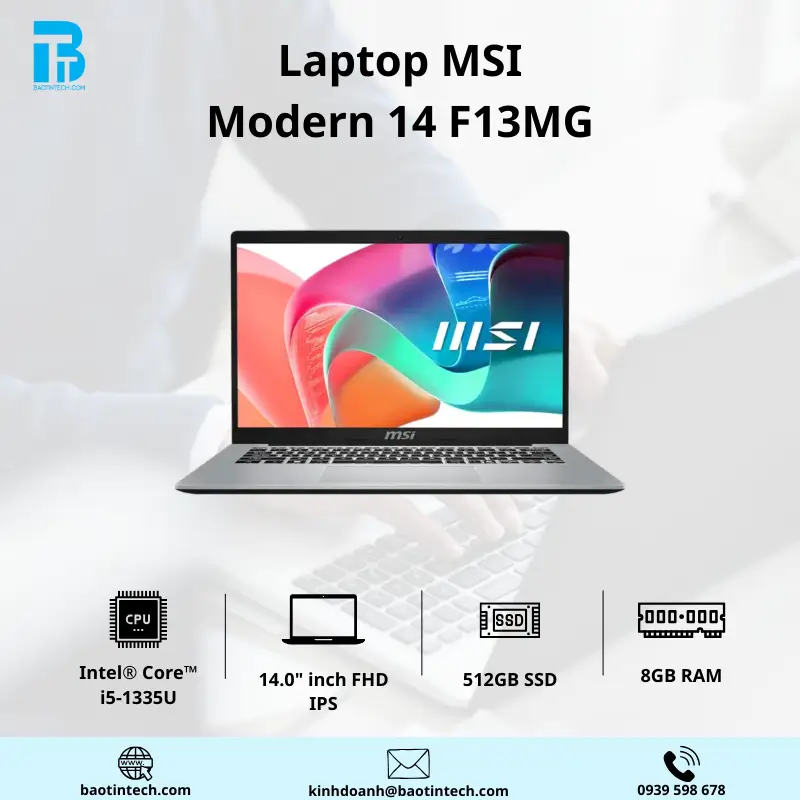MSI 14 F13MG được trang bị vi xử lý Intel® Core™ i5-1335U với 10 nhân 12 luồng, xung nhịp tối đa lên đến 4.6GHz, mang lại khả năng xử lý nhanh và ổn định cho các tác vụ văn phòng, học tập, lập trình cơ bản hay làm việc đa nhiệm. Kiến trúc CPU thế hệ mới giúp máy vận hành mượt mà, tiết kiệm điện năng nhưng vẫn đảm bảo hiệu suất cần thiết cho công việc hằng ngày.