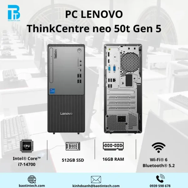 Lenovo ThinkCentre Neo 50t Gen 5 là dòng máy tính để bàn cao cấp, được thiết kế để đáp ứng nhu cầu làm việc chuyên nghiệp trong môi trường doanh nghiệp. Với cấu hình mạnh mẽ, khả năng tiết kiệm năng lượng và thiết kế thân thiện với môi trường, đây là lựa chọn lý tưởng cho các công việc đòi hỏi hiệu suất cao.